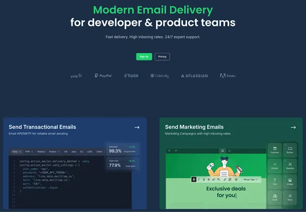 | Mailtrap | High email deliverability with industry-best analytics | 4,000 emails/month | $15/month (10K emails) | Node.js, Ruby, PHP, Python, Elixir SDKs |