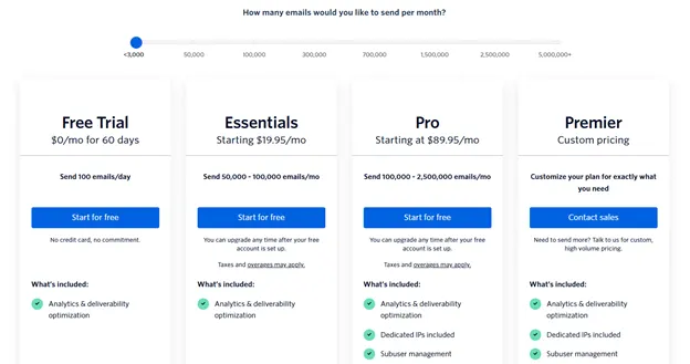 SendGrid’s pricing starts at $19.95/month, including 50,000+ emails. The Essentials plan covers mid-volume senders (50-100K emails a month), while Pro tiers (around $89.95+/month for 100,000+ emails) unlock dedicated IPs and advanced analytics. Premier plans scale beyond 2,500,000 emails with custom SLAs and pricing.