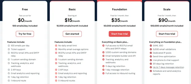 | SendGrid | Transactional + marketing in one platform | 60-day free trial; 100 emails/day | $19.95month (50K+ emails) | Multiple SDKs + extensive integrations |
