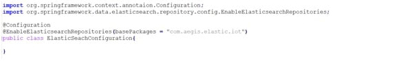 - For elasticsearch configuration, first, annotate the class with @Configuration and then to annotate it with elastic enables elastic repositories, use @EnableElasticsearchRepositories. So, once you enable elastic repositories, you have to add the base packages with mentioning your path of elastic repository class. You need to give the package structure for the repository so that when the Springboot comes up it automatically scans the repository and identifies that it's an elastic such repository.